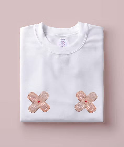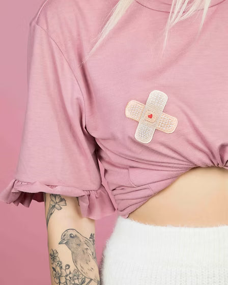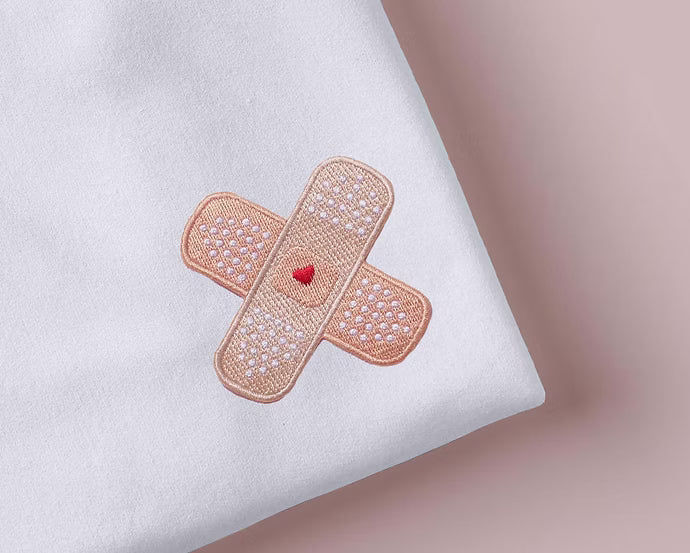 Écusson à thermocoller en forme de pansement avec un coeur rouge au centre.